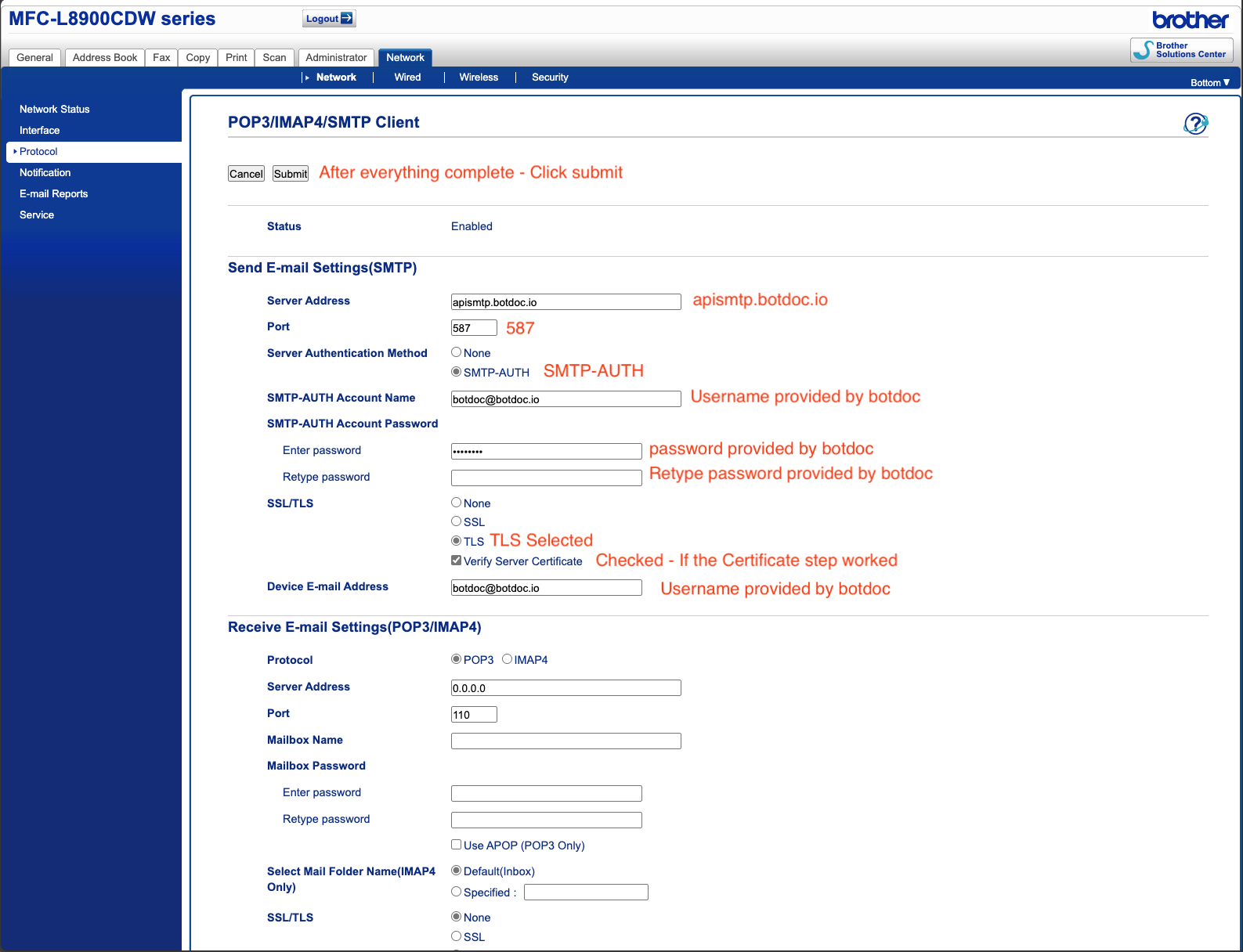 This guide explains how to configure a Brother MFP to send emails securely using Botdoc SMTP. We will install the required Root Certificate, configure the SMTP client, and test the setup.