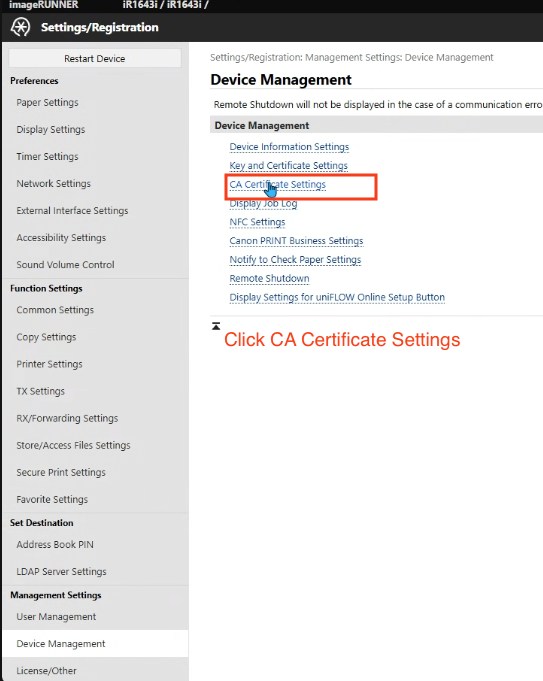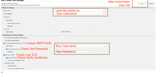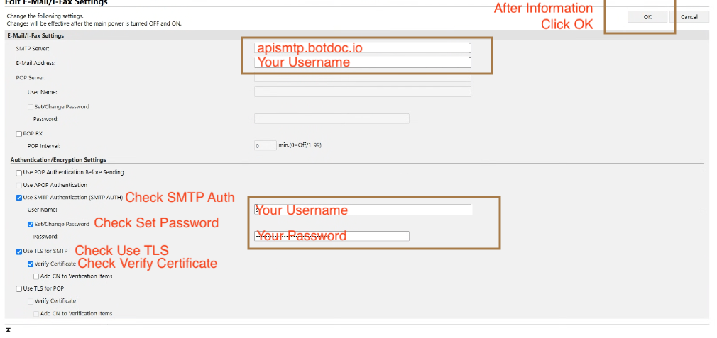 This guide walks you through configuring a Canon imageRUNNER MFP to securely send emails using Botdoc SMTP. The process includes installing the Root Certificate and setting up SMTP authentication with TLS encryption.