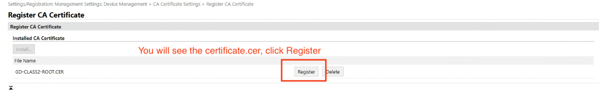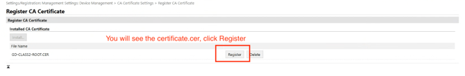 Once uploaded, you’ll see the file listed (e.g., GD-CLASS2-ROOT.CER). Click Register to finalize.