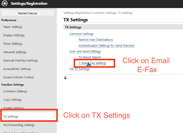 In the left menu, go to Function Settings → TX Settings → E-Mail/I-Fax Settings.