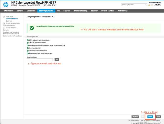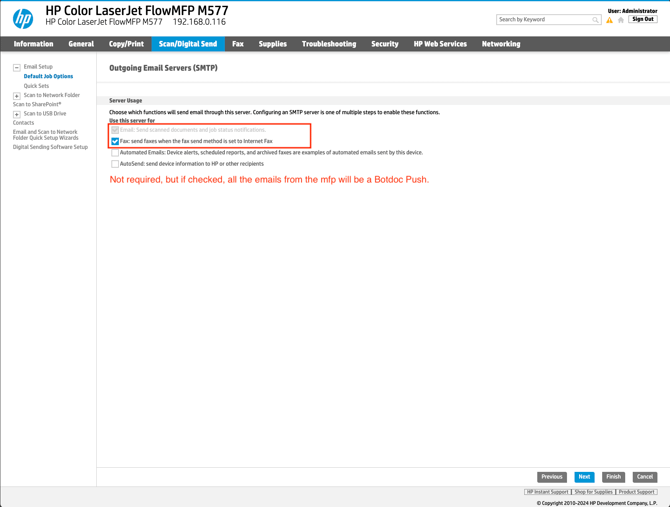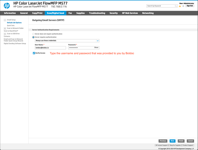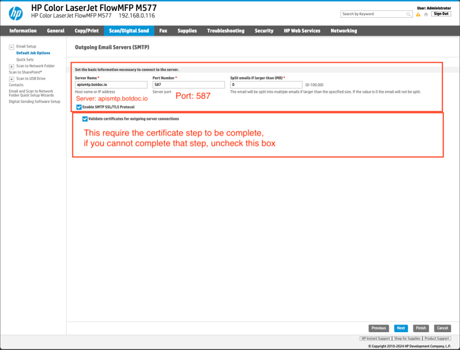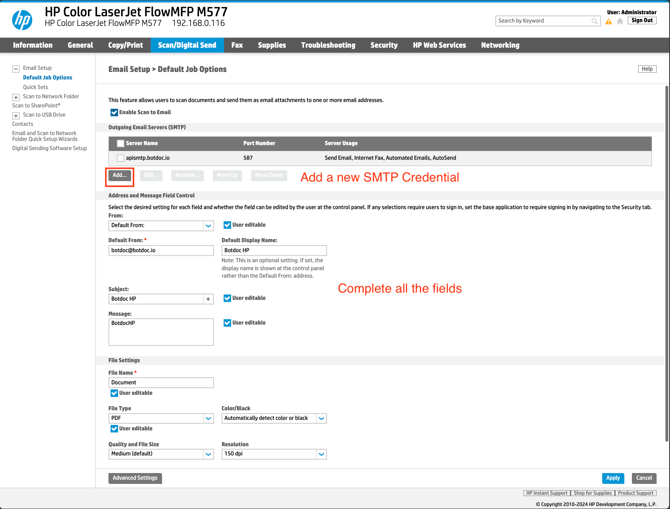 Configuring Botdoc SMTP on HP Color LaserJet Flow MFP M57