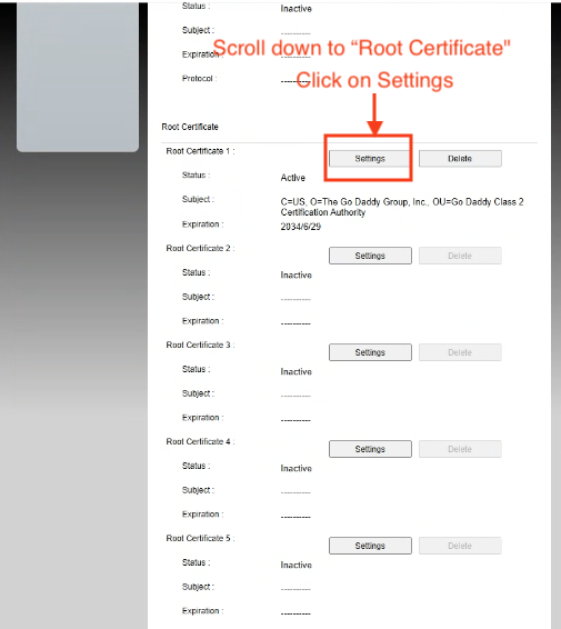 Scroll down to the Root Certificate section and click Settings under Root Certificate 1.