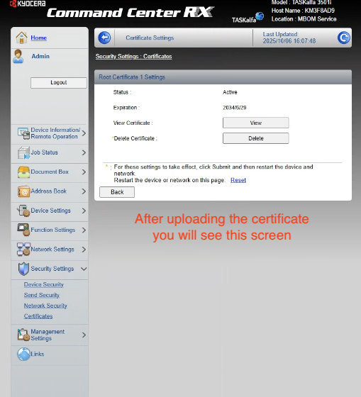 Before configuring SMTP, the Kyocera must trust the GoDaddy Root Certificate.