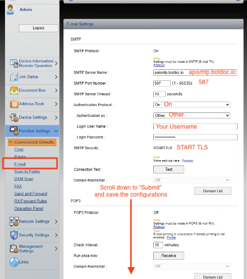 Botdoc SMTP username and password (provided by Botdoc support)