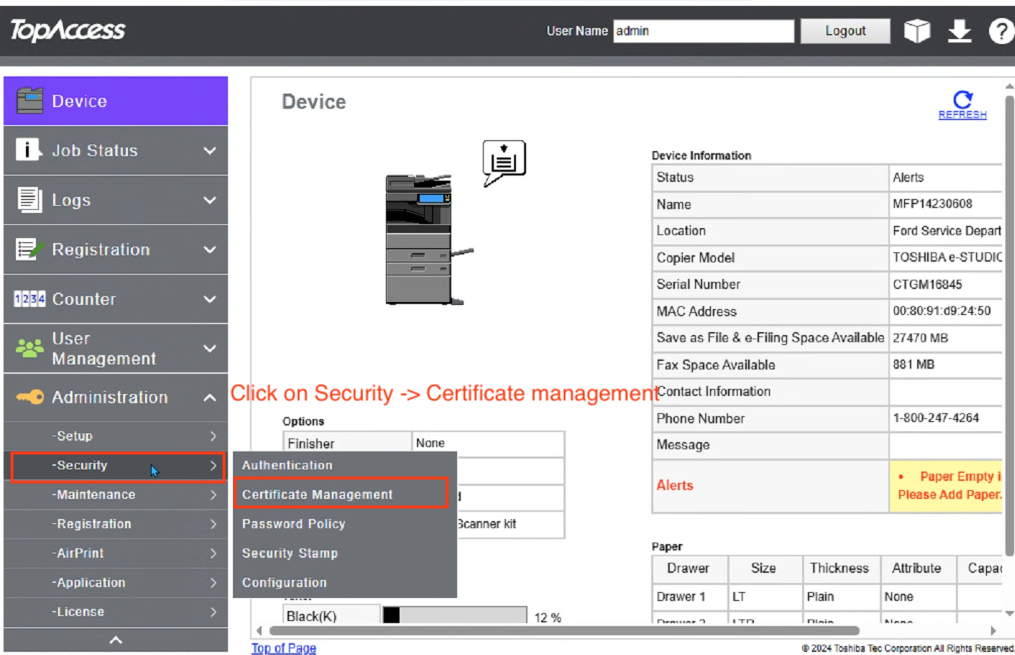 Log into the device’s TopAccess Web Interface (http://<printer-ip>) as Admin.