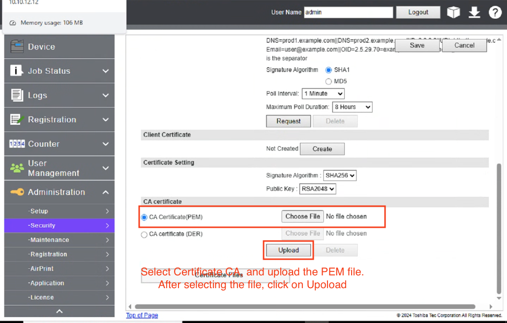 Under CA Certificate, select CA Certificate (PEM), then click Choose File.