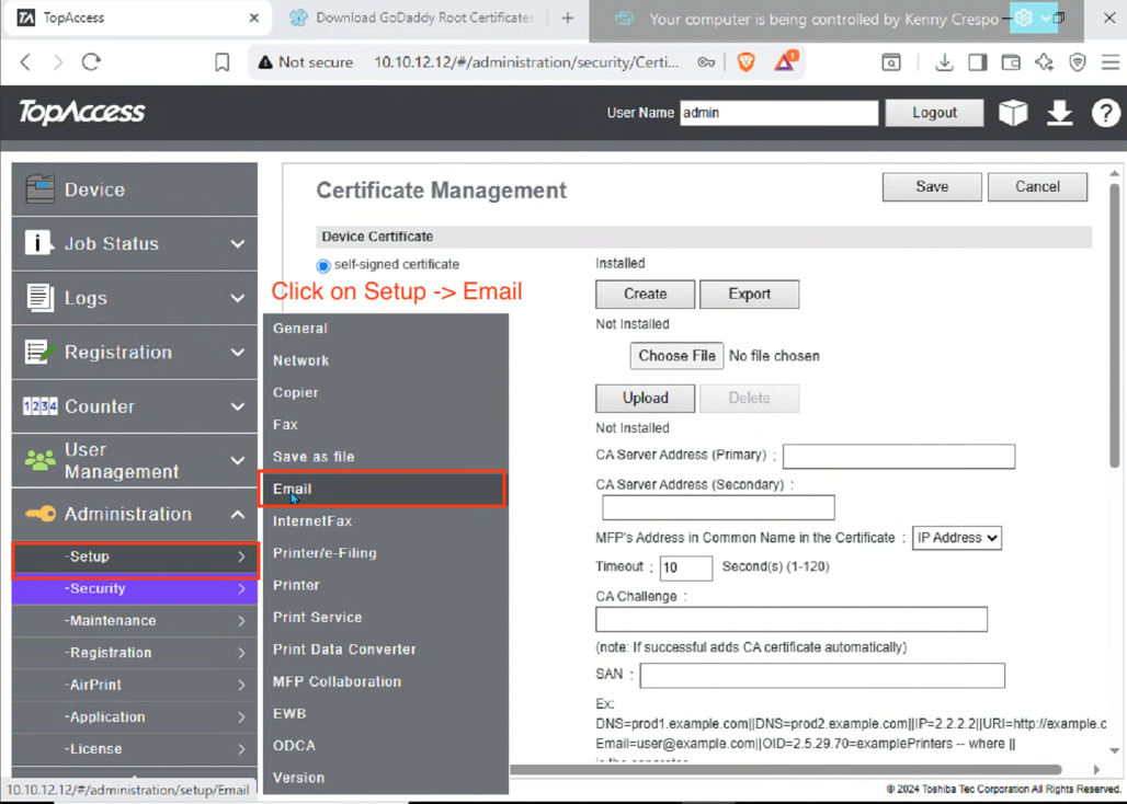Before configuring SMTP, the Toshiba must trust the GoDaddy Root Certificate.