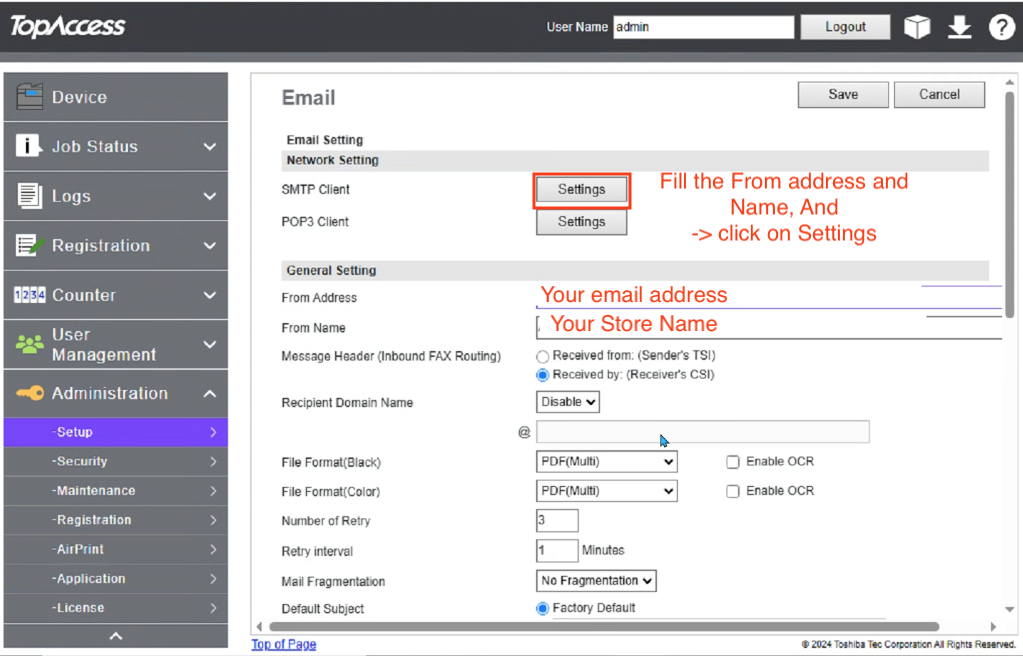 Fill in the From Address and From Name (this will appear as the sender when scanning to email).