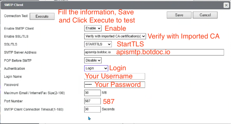 Your Toshiba MFP is now ready to send documents securely through Botdoc SMTP.