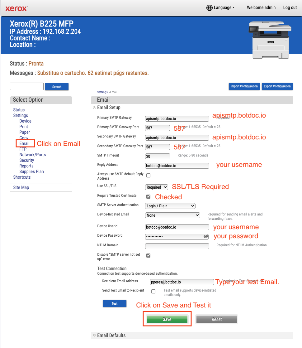 This guide explains how to configure a Xerox MFP (B225 series) to securely send emails using Botdoc SMTP. The setup includes installing the Root Certificate, configuring SMTP settings, and performing a connection test.
