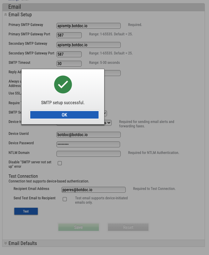 Your Xerox MFP is now fully configured to send emails securely through Botdoc SMTP using TLS encryption and a trusted GoDaddy Root Certificate.