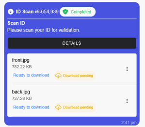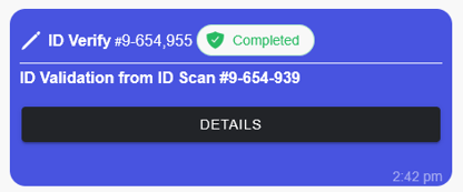 For the Botdoc user, when the scan is completed, an ID Verify feature box will appear and be correlated with the scan (Example: ID Validation from ID Scan #xxxxx), showing a "Details" button. When clicked, the details on the Driver's License or ID will be accessible.