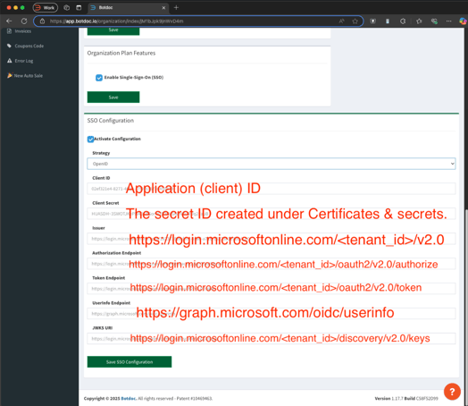 Go to My Organization, and under the SSO Configuration, click on Activate Configuration and fill in the fields.