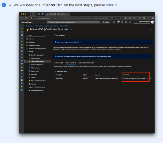 Client Secret: The secret ID created under Certificates & secrets. Created on Step 6